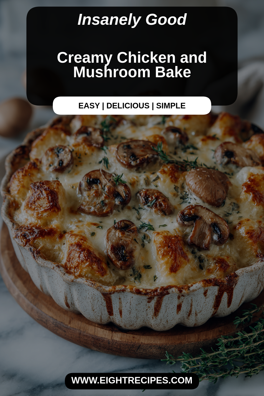 This creamy chicken and mushroom bake is the kind of weeknight dish that feels indulgent without being fussy — tender chicken pieces baked in a savory, mushroom-heavy cream sauce, topped with a golden, slightly crisp cheese crust. It’s cozy, reliable, and perfect for evenings when you want something comforting on the table with minimal drama.