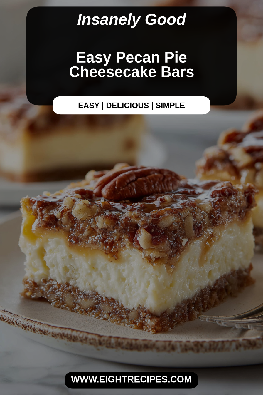 These delightful pecan pie cheesecake bars combine the richness of cheesecake with the sweet, nutty flavor of pecan pie. They make for a perfect dessert that's sure to please any crowd!