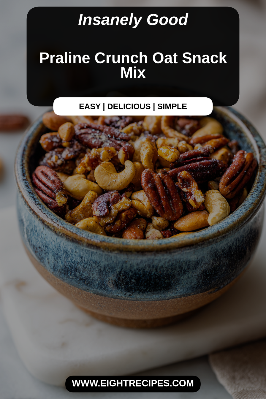 This Praline Crunch Oat Snack Mix is my go-to snack when I want something that feels indulgent but still sensible — clusters of toasted oats and pecans lacquered in a praline-like caramel, with a little salt and crunchy mix-ins for contrast. It’s sweet without being cloying, holds up well in a jar, and is exactly the kind of snack I find myself reaching for between meals or sprinkling over yogurt and ice cream.