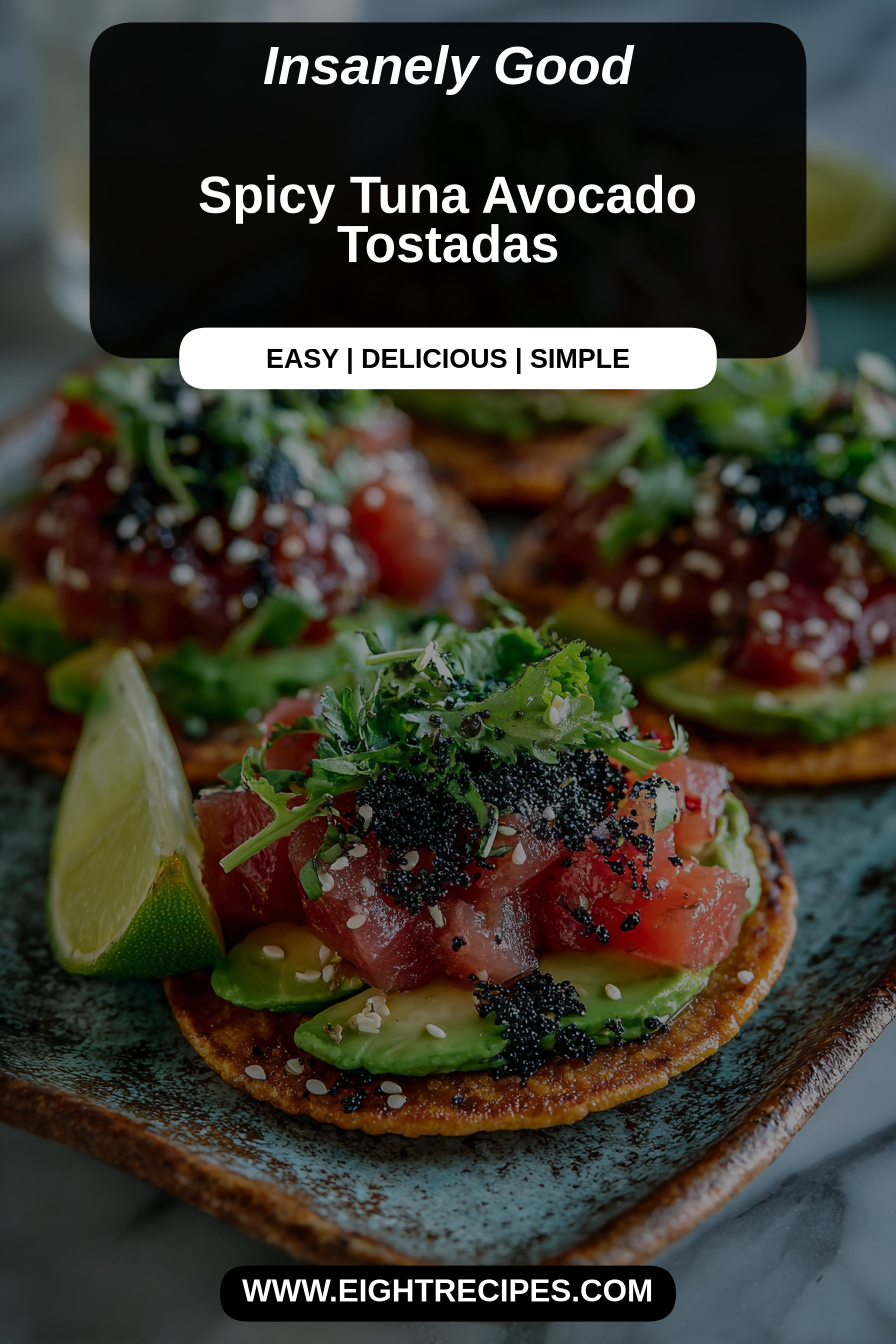 These Spicy Tuna Avocado Tostadas are quite satisfying on their own, but if you’re looking to round out the meal, a light and refreshing side salad dressed with a simple vinaigrette would be perfect. A bowl of tortilla soup or some quick black beans seasoned with a little garlic and lime would also complement the flavors beautifully. For an even more casual spread, a side of crisp jicama sticks or cucumber slices would offer a refreshing contrast.